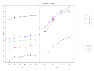 These values are all referred to the gran mean, which we can simply calculate with the function mean(dat$yield) and it is equal to 69.83. This means that the mean for N0 would be 69.83-4.855 = 64.97. we can verify that with another call to the function model.tables, this time with the option type=”means”: