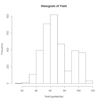 hist(dat$yield, main="Histogram of Yield", xlab="Yield (quintals/ha)")