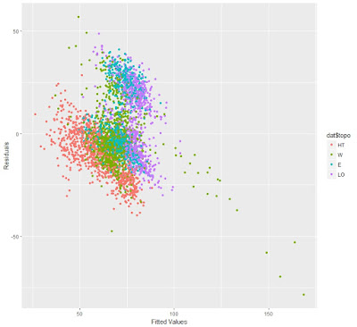 As you can see the line is horizontal, which means the residuals have no trend. Moreover, their spread is more or less constant for the whole range of fitted values. As you remember we assume the error term of the linear model to have zero mean and constant variance. For both these reason I think we can consider that the model meets both assumptions. However, if we color the points based on the variable topo (which is not shown but it is very easy to do with the option col in qplot) we can see that the 3-4 smaller clouds we see in the plot above are produced by particular topographical categories. This coupled with the fact that our data are probably autocorrelated, since they are sampled in space, may let us conclude that we should not assume independence and therefore GLS would be the best method.